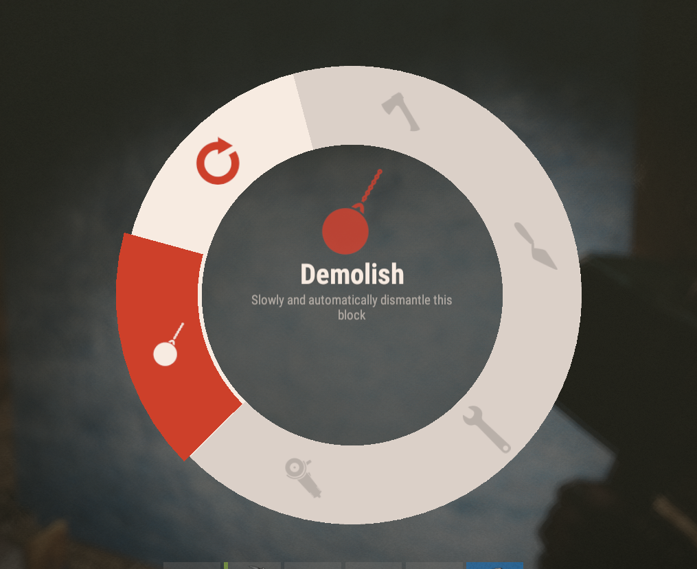 Здесь всё почти так же, как при вращении. Доступен пункт «Разрушить или «Demolish» лишь какое-то время после возведения постройки. Вам нужно взять киянку, подойти к стене, найти угол обзора, под которым стена засветится синим цветом, нажать правую клавишу мыши и выбрать нужную опцию, если у вас будет время на её использование.